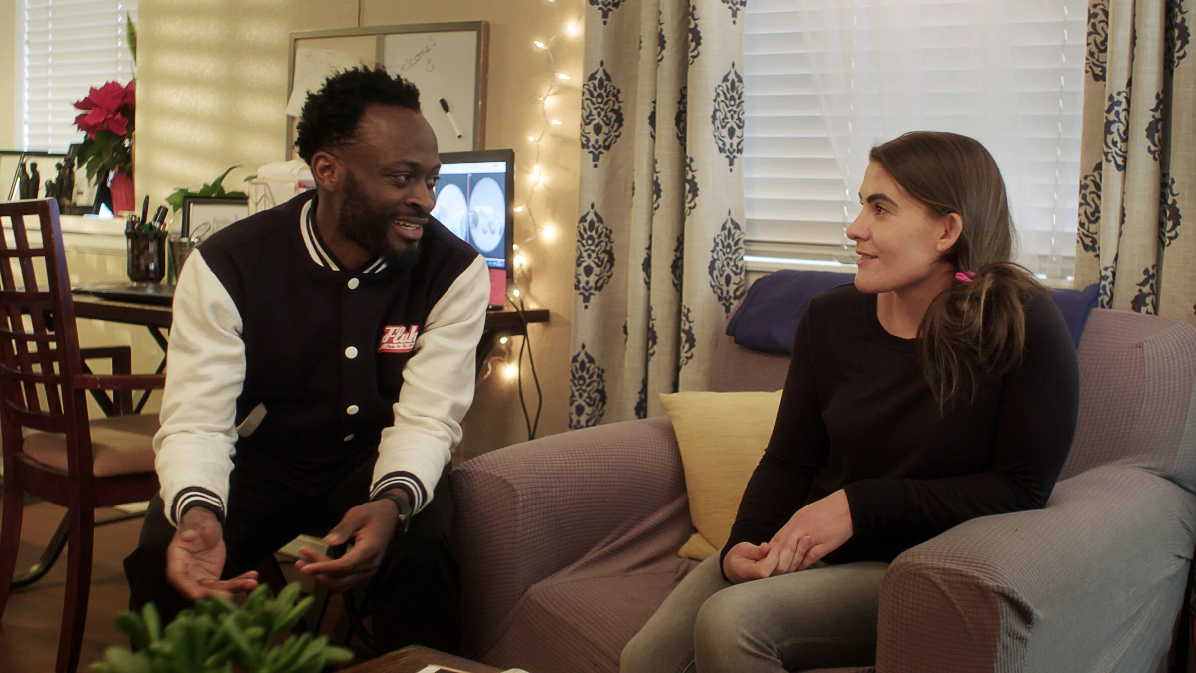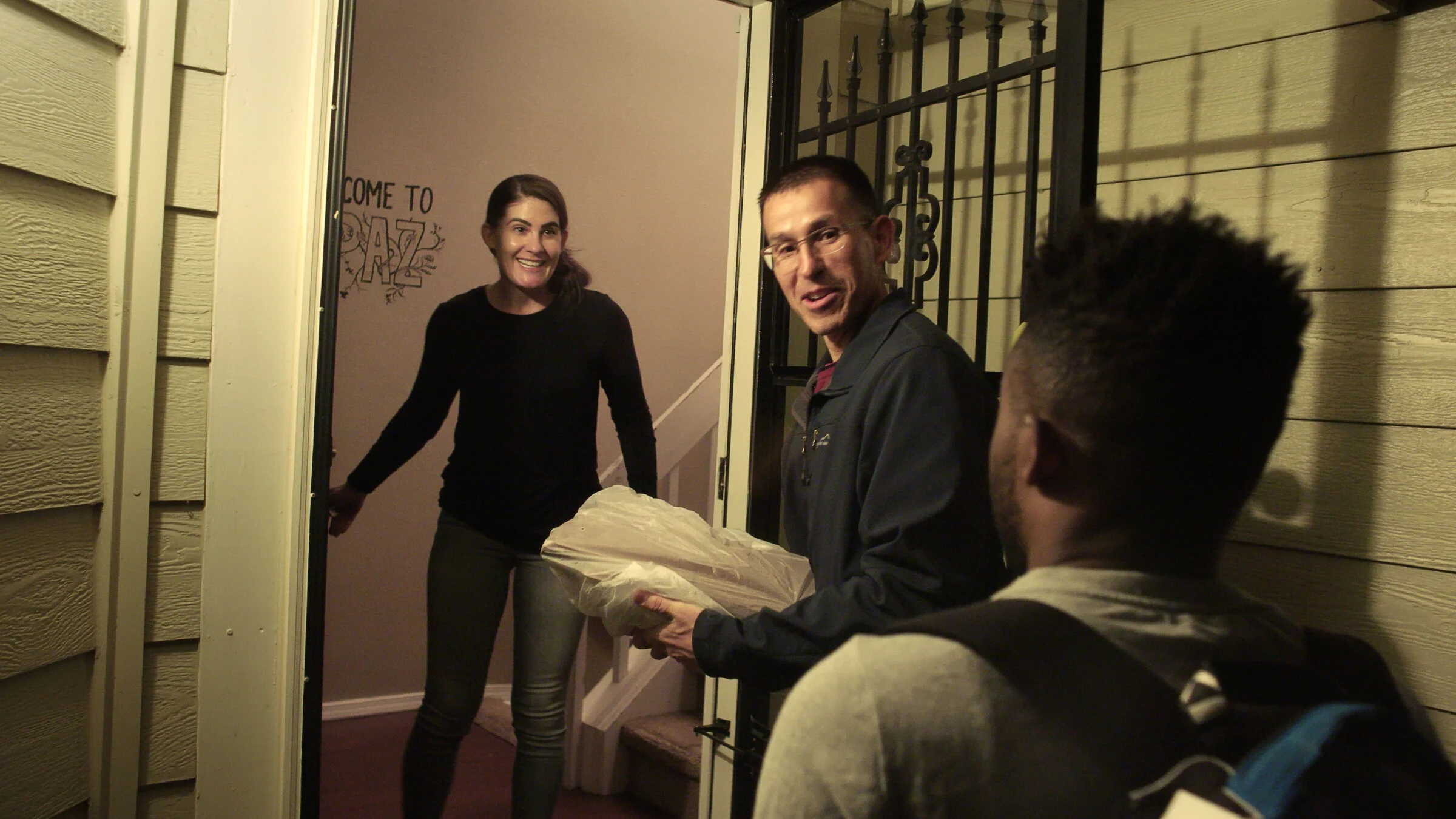 Sarah and a volunteer greet a new guest to Casa de Paz.